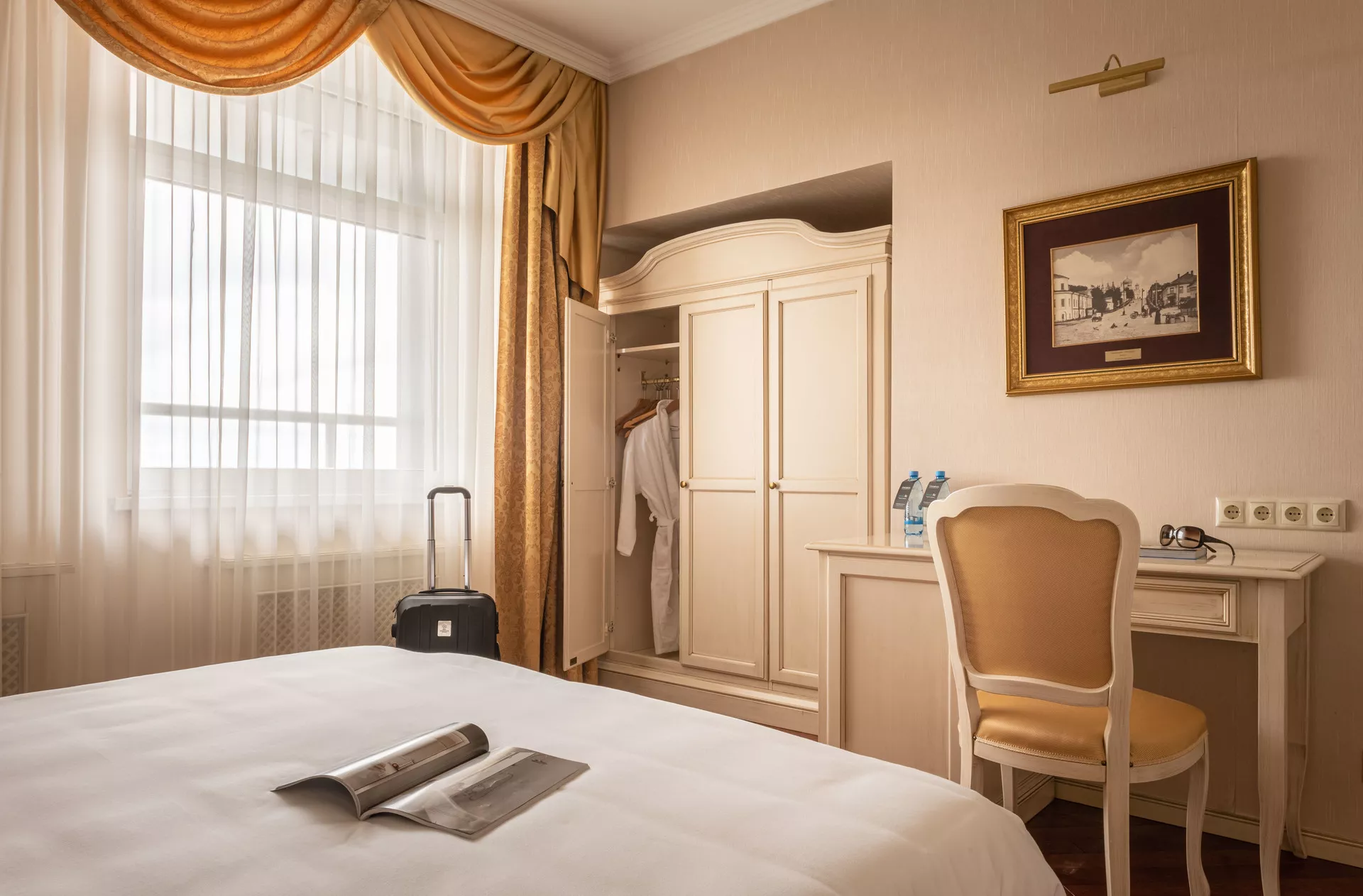 Вас приятно удивит продуманность каждой детали в номере Люкс. В практичной гостиной приятно отдохнуть на диване и посмотреть телевизор. В спальне можно воспользоваться письменным столом с удобным креслом или расслабиться на широкой двуспальной кровати после насыщенного дня.