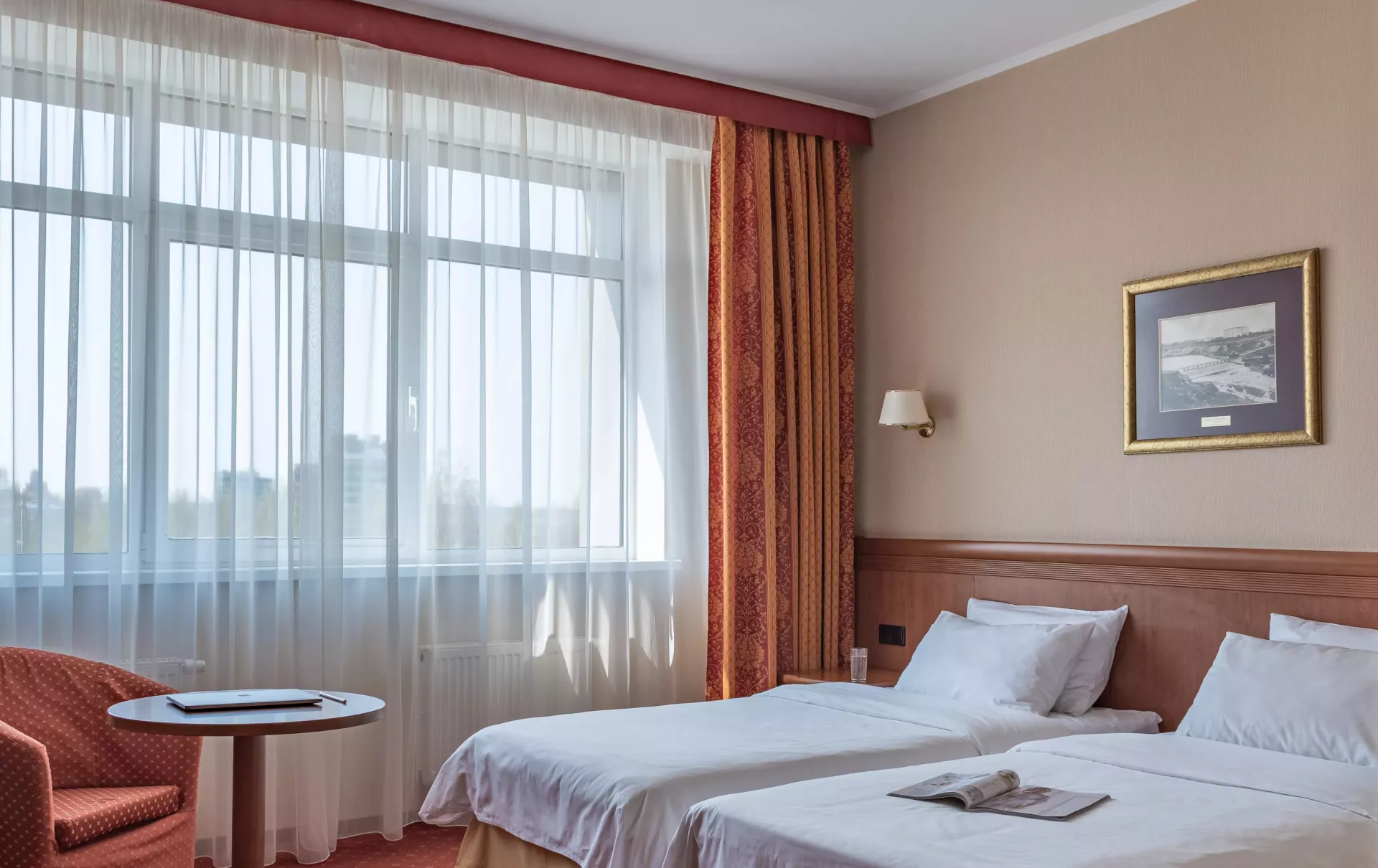Вас приятно удивит продуманность каждой детали в номере Люкс. В практичной гостиной приятно отдохнуть на диване и посмотреть телевизор. В спальне можно воспользоваться письменным столом с удобным креслом или расслабиться на широкой двуспальной кровати после насыщенного дня.
